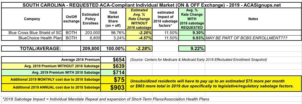 South Carolina: Preliminary 2019 #ACA rate hikes: 9.2% instead of ~2.3% *lower* without #ACASabotage