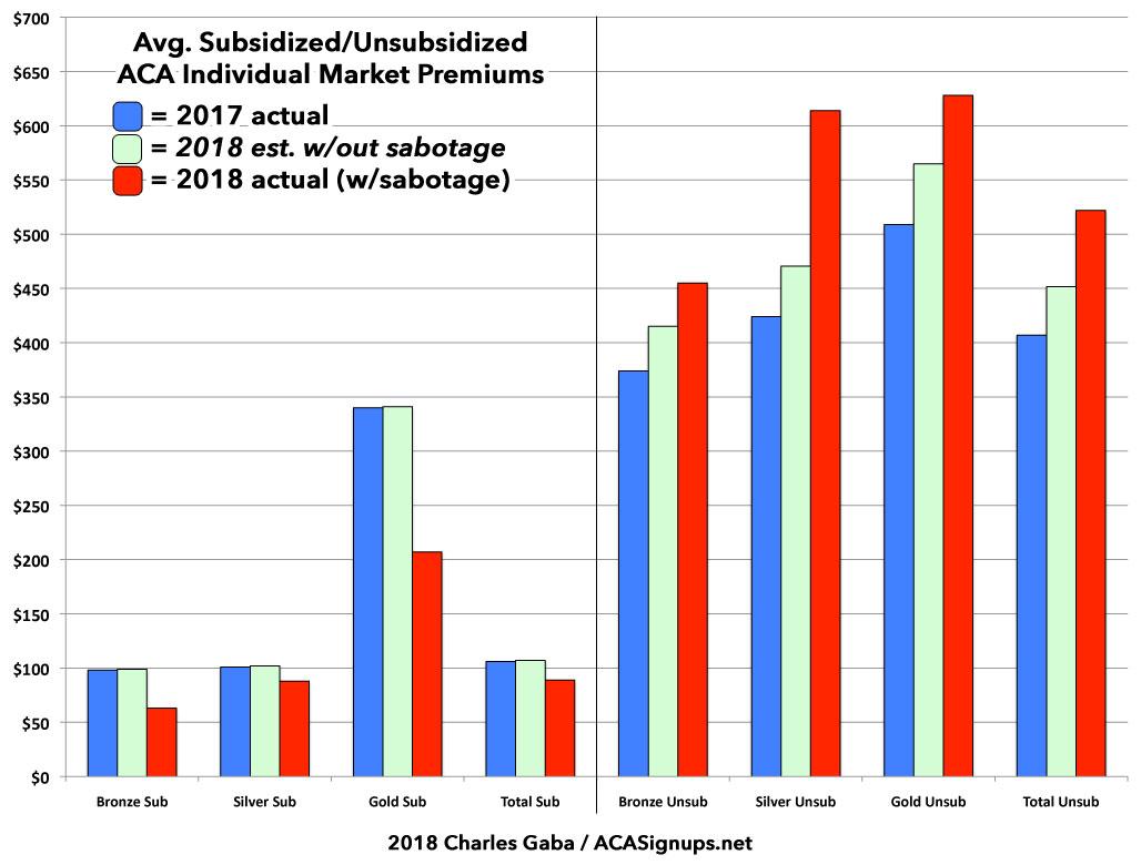 Well, as I demonstrated repeatedly last fall and earlier this year, of the 28% average unsubsidized rate hikes nationally, rates would have only gone up perhaps 10-11% in that scenario, with the additional 17 points or so being caused by the CSR cut-off and related sabotage efforts. I've therefore expanded on the GAO graph above with my own, which includes my best estimates of how 2018 premiums would have changed for each population in that alternate universe (I've also moved the subsidized enrollees to the left side of the graph, where it makes more sense to have them). I've sandwiched the "alternate universe" bars in light green between the actual 2017 and 2018 premiums: