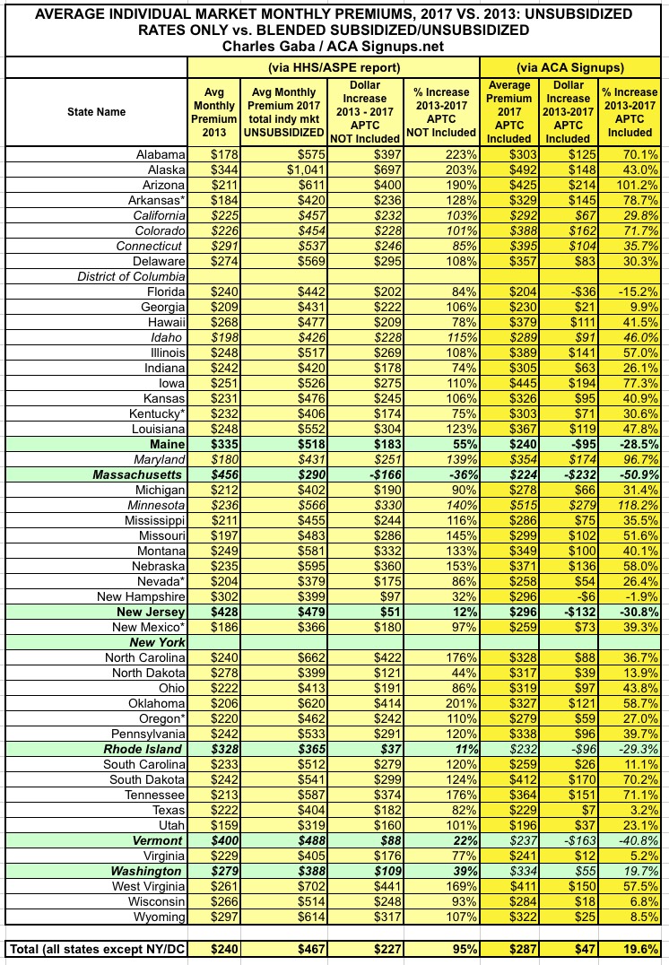 NY then raised rates by an average of 13% in 2015, 7.1% in 2016 and 16.6% this year. That should make their 2017 average around $304/month today...or still 29% lower than they were in 2013. And again, this is for unsubsidized premiums. There's still too much fuzziness here for me to feel comfortable plugging it into the spreadsheet, but this still underscores the larger point: You simply cannot properly compare two insurance premium numbers when one of them prevents carriers from cherry-picking/discriminating and the other one doesn't.