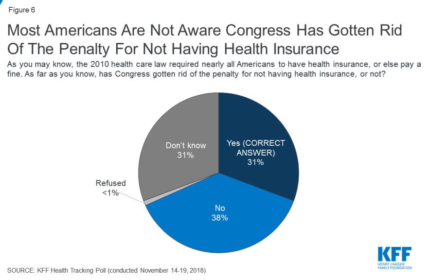 Having said that, let's get back to the Kaiser survey above: 31% of the country knows that the mandate has, in fact, been repealed, effective January 1st, 2019. However, a full 69% either think it hasn't been repealed or don't know whether it has or not.
