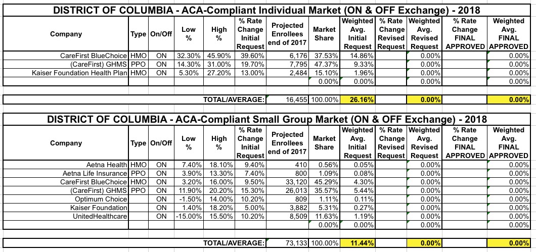 The District of Columbia is the 6th state (OK, it's not a state but it's considered one legislatively for purposes of the ACA) to post their initial 2018 rate filings (h/t to Louise Norris for the heads up). For 2017, the weighted average rate increase for the individual market was a mere 7.3%, highly unusual for this year, while the small group market increase was almost non-existent: Just 0.4% overall.