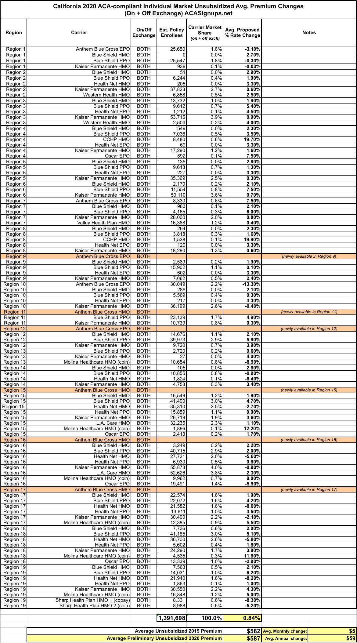 I actually went through the detailed breakout for all 19 regions in the state and compiled the full weighted average rate changes for the entire on-exchange ACA individual market...and sure enough, it comes out at +0.84%. They don't include the enrollment numbers for the off-exchange portion of the individual market (around 800,000 people), but I'm assuming that the market share breakout is fairly close to the on-exchange portion since CoveredCA insists that 0.8% refers to the entire market, on & off combined: