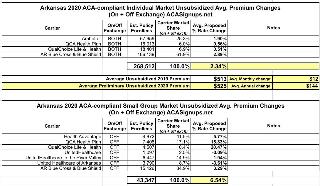 The Arkansas Insurance Dept. just posted their preliminary 2020 individual and small group market premium rate change requests. For the most part it's pretty straightforward: Individual market premiums are increasing about 2.3% statewide, while small group plans are going up 6.5% overall.