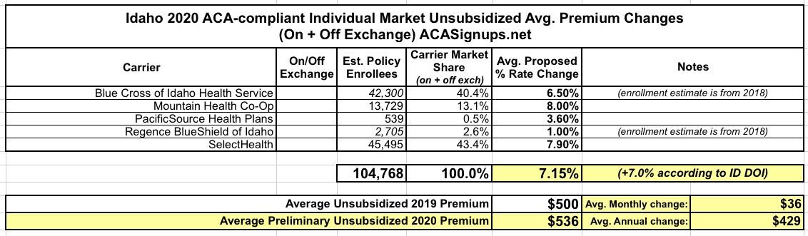 Idaho: *Preliminary* avg. 2020 ACA rate changes: 7.0% increase