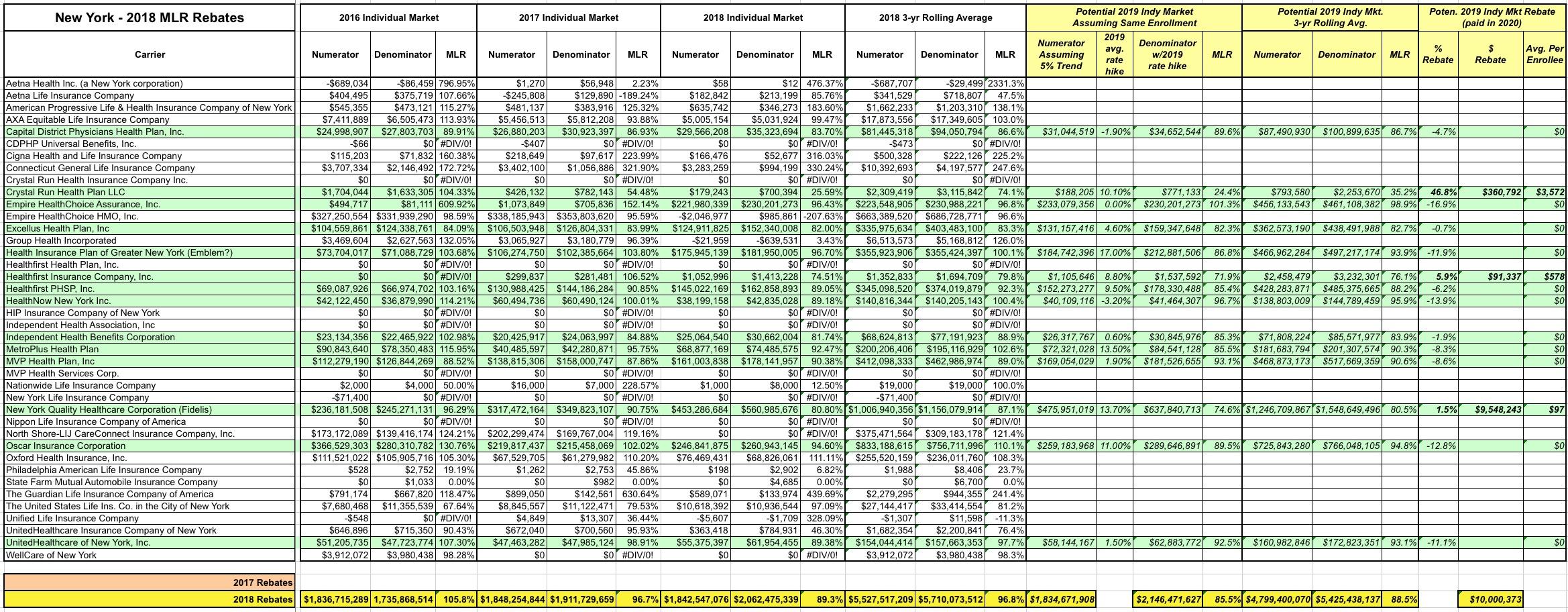 Here's one interesting tidbit: Just as I discovered that the MLR threshold in Massachusetts is 88% for the Individual and Small Group markets, New York also has a higher MLR threshold than the ACA requires: 82%. This is the only reason "US Life Insurance Co. of NY" even had to pay back that much to indy plan enrollees.