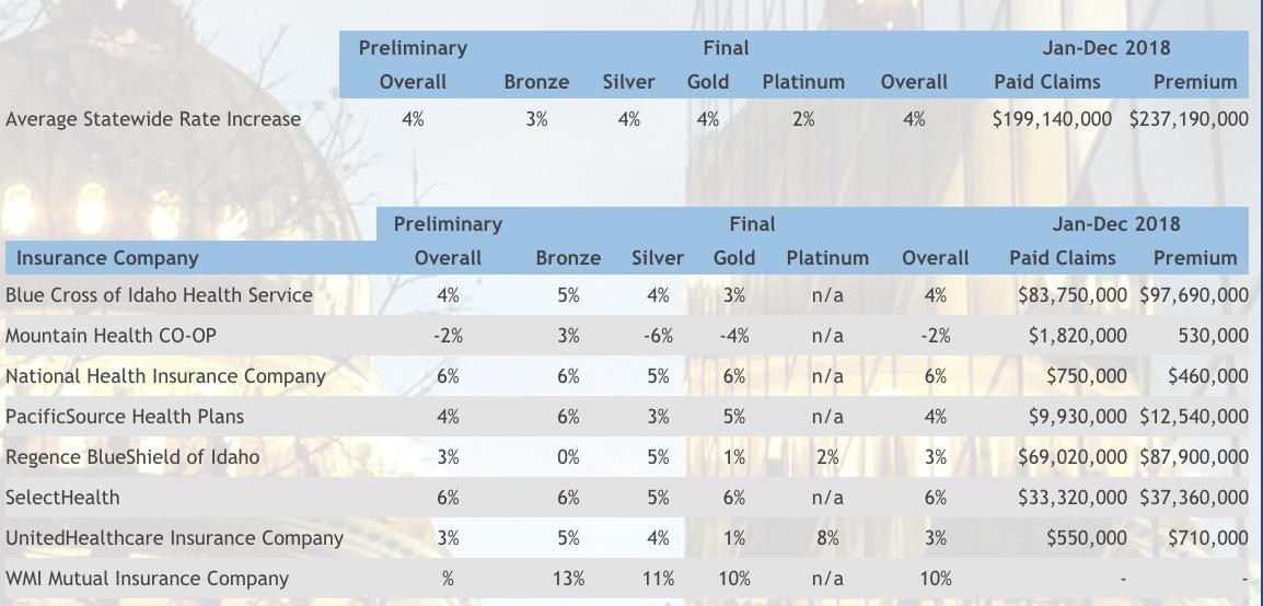Not much to see here...in August, the Idaho Insurance Dept. posted their preliminary 2020 average rate changes for the individual & small group markets; they averaged 7.0% and 4.0% increases respectively. Today they've posted the final/approved rates, and the indy numbers have been whittled down ever so slightly: