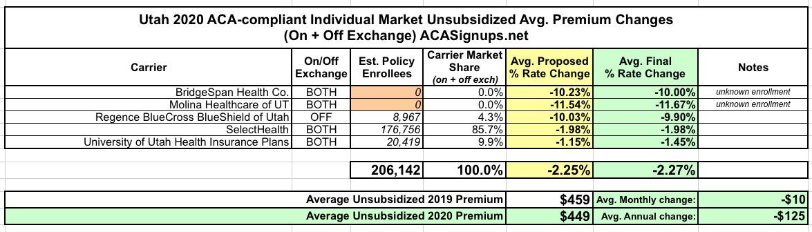 Utah: *Final* avg. unsubsidized 2020 #ACA premiums: 2.3% reduction (w/caveat)