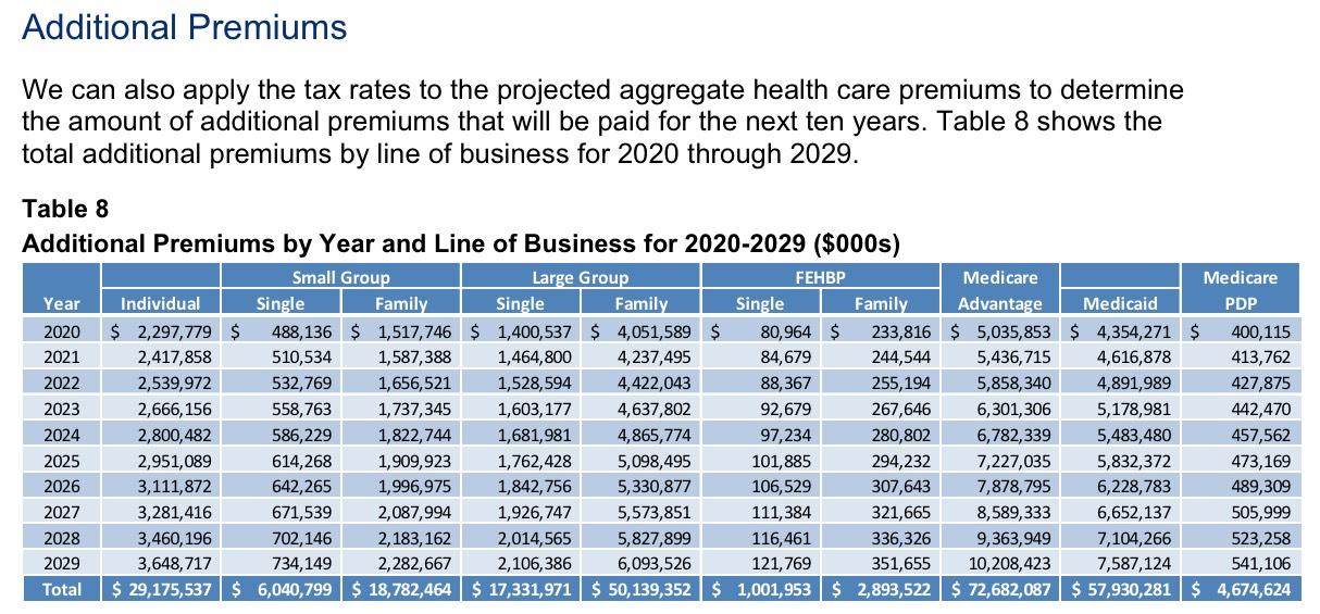 The taxes on health insurance are non-deductible for federal tax purposes for health insurers. Therefore, for each dollar assessed and paid in taxes, more than a dollar in additional premiums must be collected (e.g. $1.27 for every $1.00 in taxes, assuming a 21% federal corporate income tax rate) yielding a total premium impact in 2020 of as much as $20.3 billion. In total, the amount assessed and collected is projected to be over $260 billion over the ten-year period of 2020 to 2029.