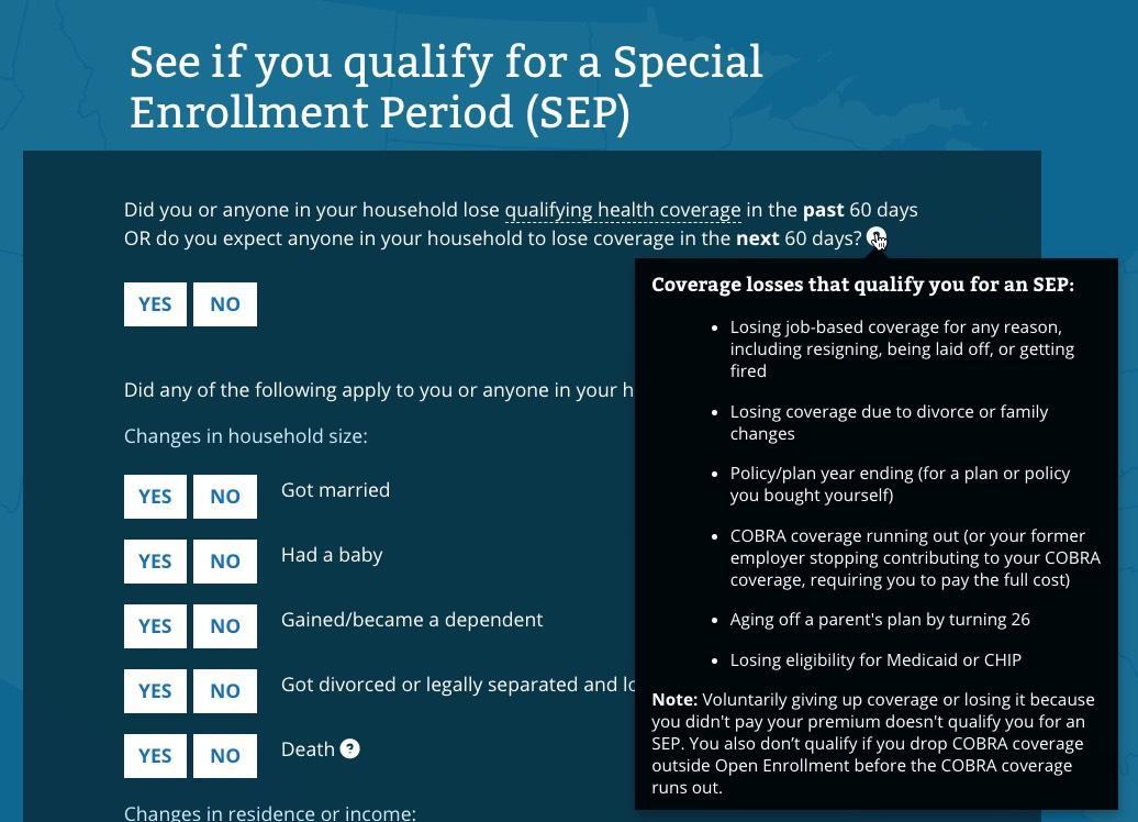 I don't actually see anything in the text above which clarifies anything regarding "flexibility on documentation". I'm not entirely sure what it means...does it mean a simple written explanation like Idaho is allowing? Here's the screens you'll see when you check to see whether you qualify for a Special Enrollment Period. The first three look mostly the same...