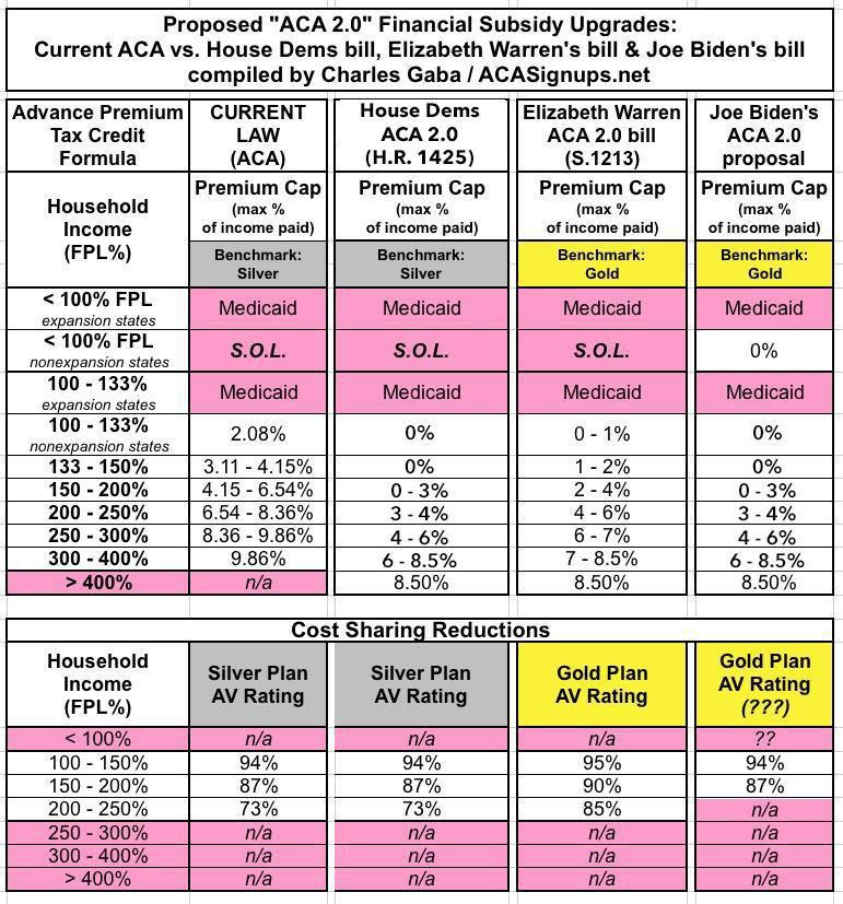 I could be wrong about Biden's plan in the CSR portion of the table, since he doesn't specify whether or not he intends on keeping CSR in place at all, although the upgrade from Silver to Gold would accomplish most of that anyway...in fact, the 73% AV threshold would become moot since the Gold benchmark plan itself would be set at 80% AV to begin with.