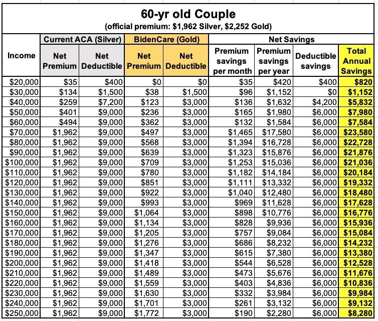 At 60 years old, the savings at lower incomes would remain the same (between $800 - $4,400/year), but middle class enrollees would save up to $9,600/year: As much as $6,600 in premiums (mostly due to the subsidy cliff being eliminated), plus the deductible being lopped down to 1/3 of the prior level.