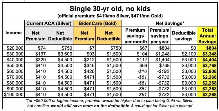 Assuming it utilizes the revised H.R. 1425 APTC formula, Biden's plan would save a the average single 30-year old without any children a minimum of $800/year and for some enrollees over $4,400/year depending on their income. At higher income levels they'd lose the premium savings if they enrolled in the Gold plan vs. Silver, but would still have a deductible that's $3,000 lower, for a net savings of over $2,200/year. Of course they'd also still have the option of enrolling in the Silver plan after all, which would reduce their premiums by $732/year but increase the deductible instead.