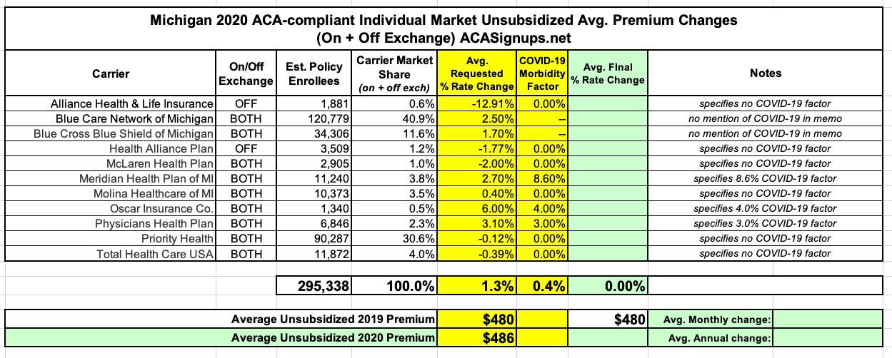 Michigan is the 8th state (by my count) where the insurance carriers have posted their preliminary 2021 premium rate change filings. Every year brings some new twist (in 2018 it was CSR reimbursement payments being cut off; in 2019 it was the zeroing out of the ACA's federal individual mandate penalty; in 2020 it was sort of the repeal of the ACA's health insurer tax (HIT), although that didn't actually happen until after 2020 premiums had already been locked in; and for 2021...it's the COVID-19 pandemic, of course.