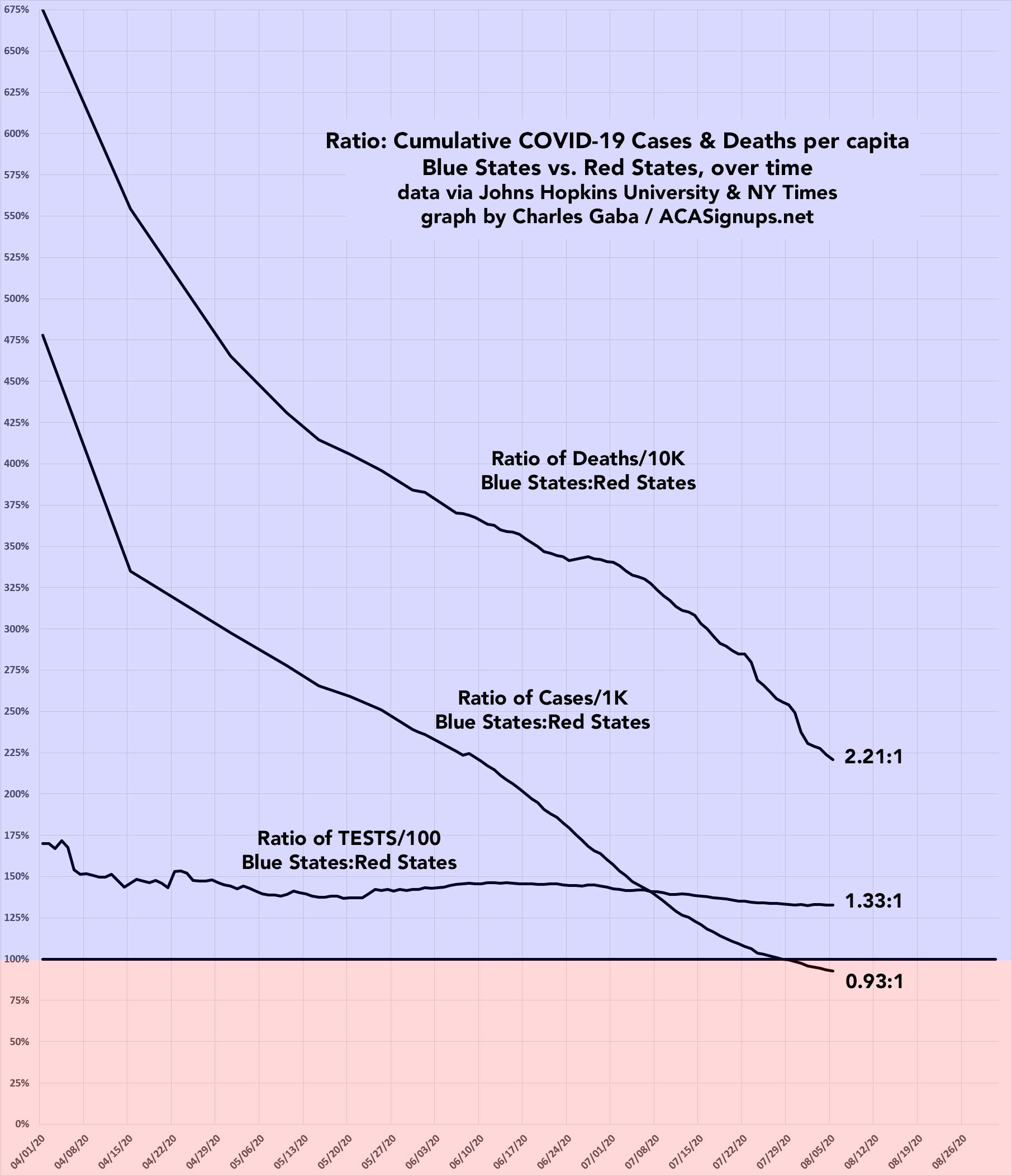It's also possible that some states are testing different demographic groups at a higher rate than others: If the red states are testing a much higher percentage of elderly nursing home residents than the blue states are, for instance, that would likely skew the ratio their way, and so on.
