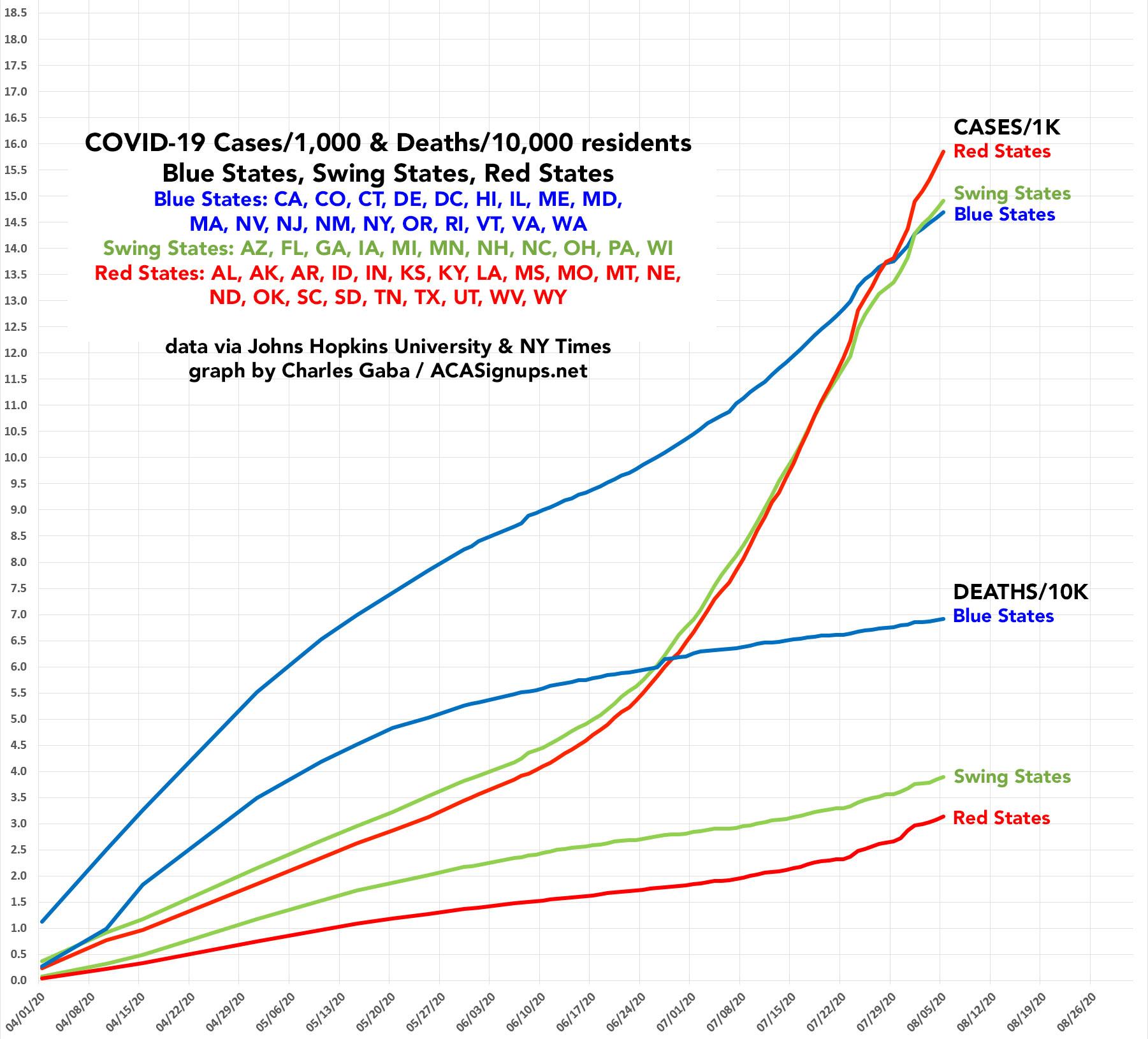 With this in mind, I've been tracking the spread of the virus across every state on a daily per capita basis, both in cases per 1,000 residents and deaths per 10,000 (I use the different scales to make it easier to see the trendlines of each on the same graph). Here's where things stand as of today, with all 50 states + DC grouped into Blue States, Red States and Swing States. The definition of "Swing State" is a bit arbitrary; I've picked the nine which have been traditionally considered to fall into that category, along with Arizona and Georgia, the "new sun belt" swing states: