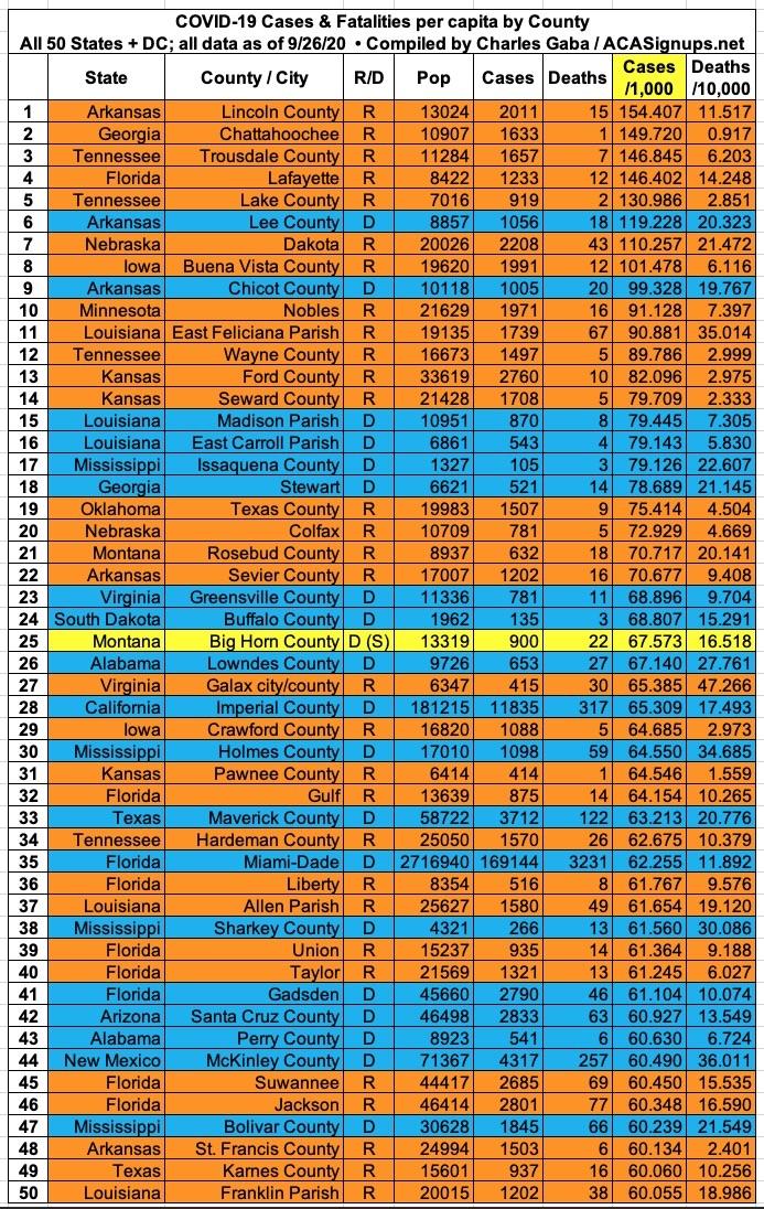 With these updates in mind, here's the top 100 counties ranked by per capita COVID-19 cases as of Saturday, September 26th (click image for high-res version). Blue = Hillary Clinton won by more than 6 points; Orange = Donald Trump won by more than 6 points; Yellow = Swing District
