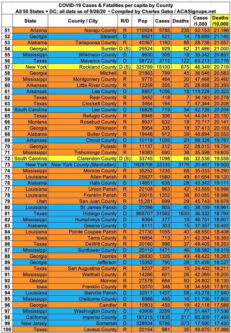 Here's the top 100 counties ranked by per capita COVID-19 fatalities as of Saturday, September 26th (click image for high-res version):