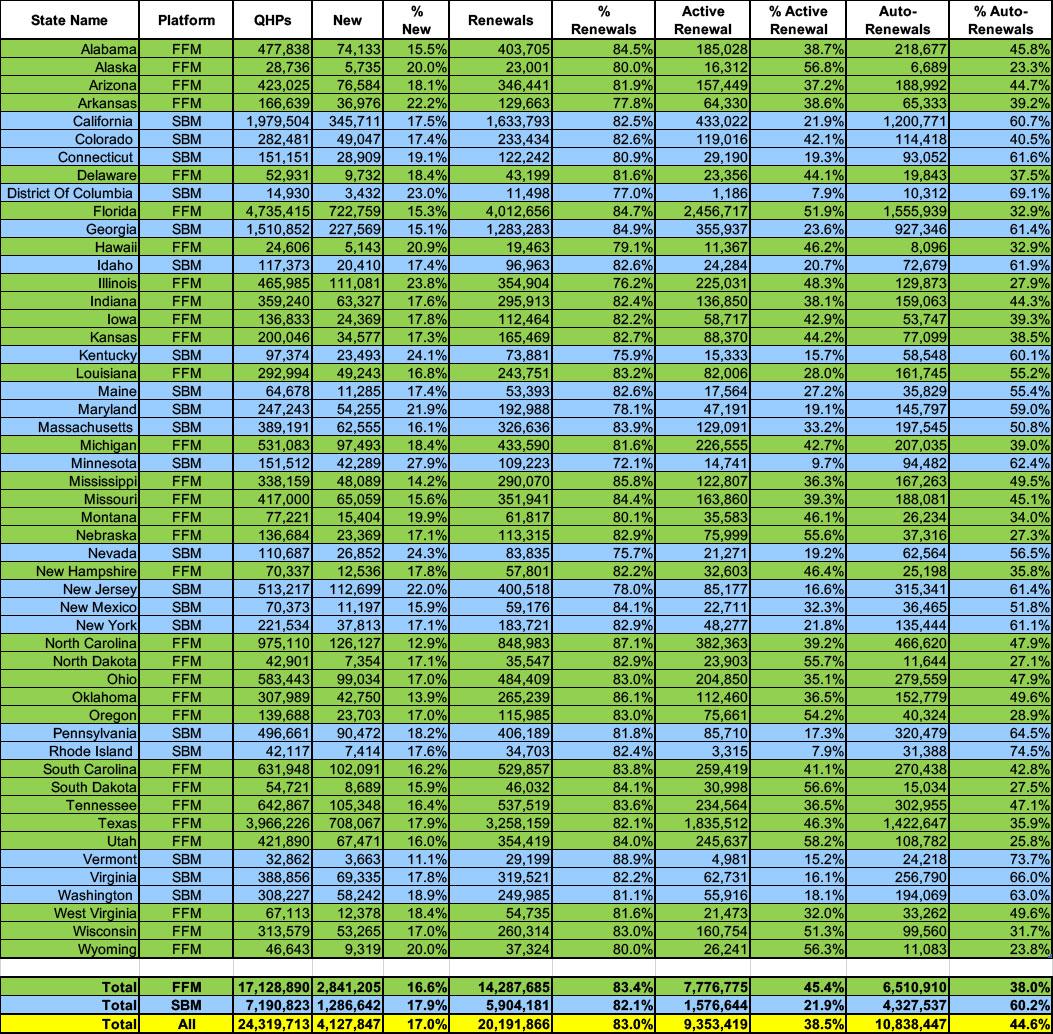 First up: Breaking out new enrollees vs. existing enrollees who either actively re-enroll in an exchange plan for another year or who passively allow themselves to be automatically renewed into their current plan (or to be "mapped" to a similar plan if the current one is no longer available).