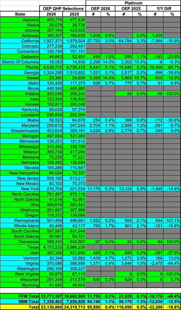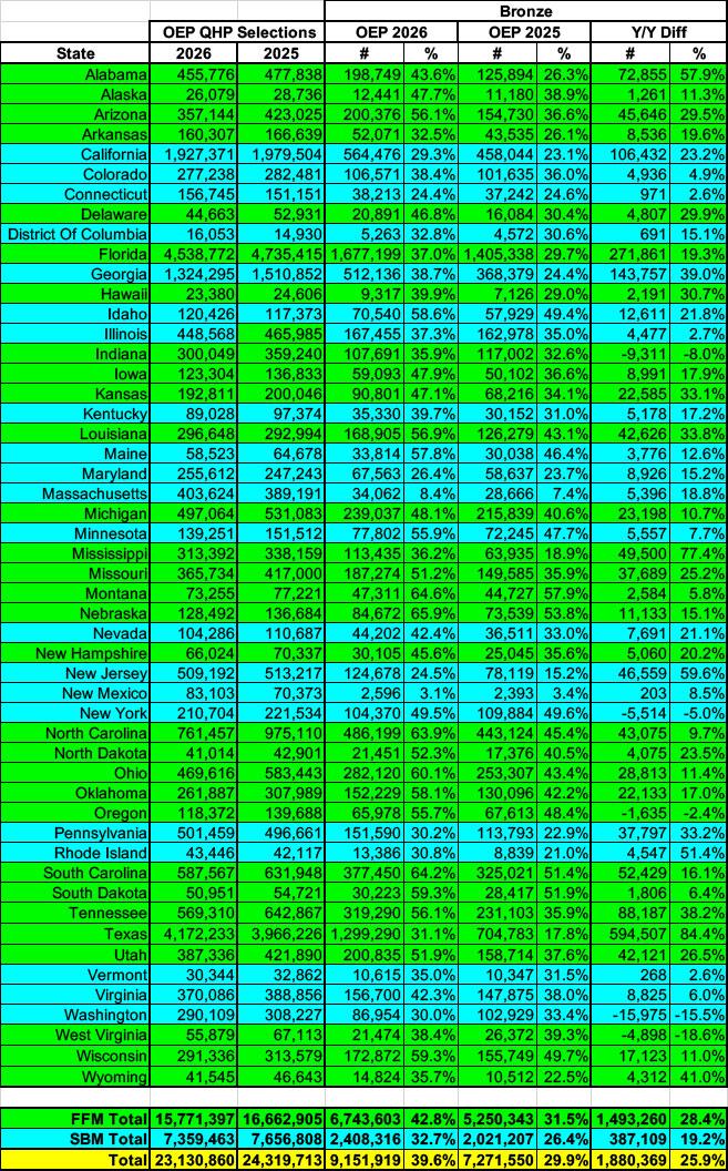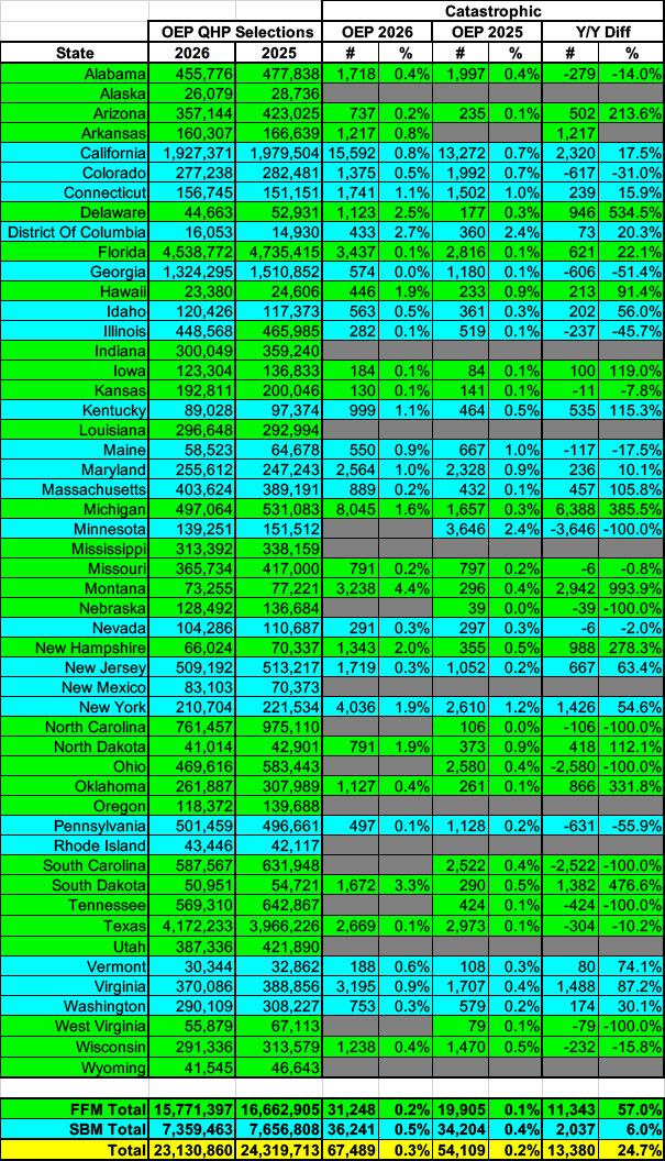 Catastrophic Plans: Considering how much effort the Trump Regime put into shoving Catastrophic plans down everyone's throats (Trump's Council of Economic Advisors was actually projecting up to 3 MILLION people to enroll in one), the actual 2026 OEP Catastrophic Plan selection tally is pretty laughable: While it did increase by an impressive 24% over 2025, that still only brings the grand total to...fewer than 68,000. The Trump Regime was off by a factor of 44x or so.