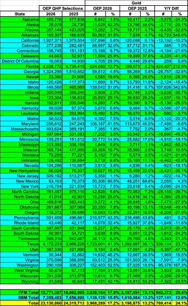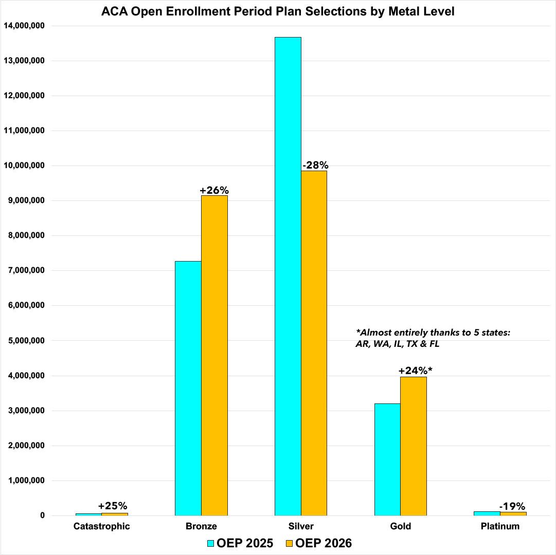 Finally, Gold plan enrollment, which I was expecting would also drop, actually increased in both raw numbers as well as as a percentage of the total, from 13.2% to 17.2% of all 2026 OEP plan selections...again for reasons I'll discuss soon.