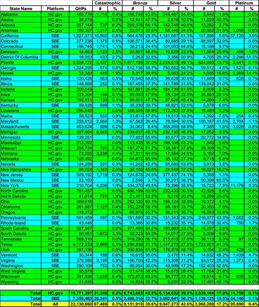 WARNING: The table below is a monster which includes the year over year changes (both raw numbers and percentages) for all five metal levels by state. It's almost certainly not going to be readable on anything but the highest-resolution monitors, so I've broken it into five smaller tables beneath the main one: