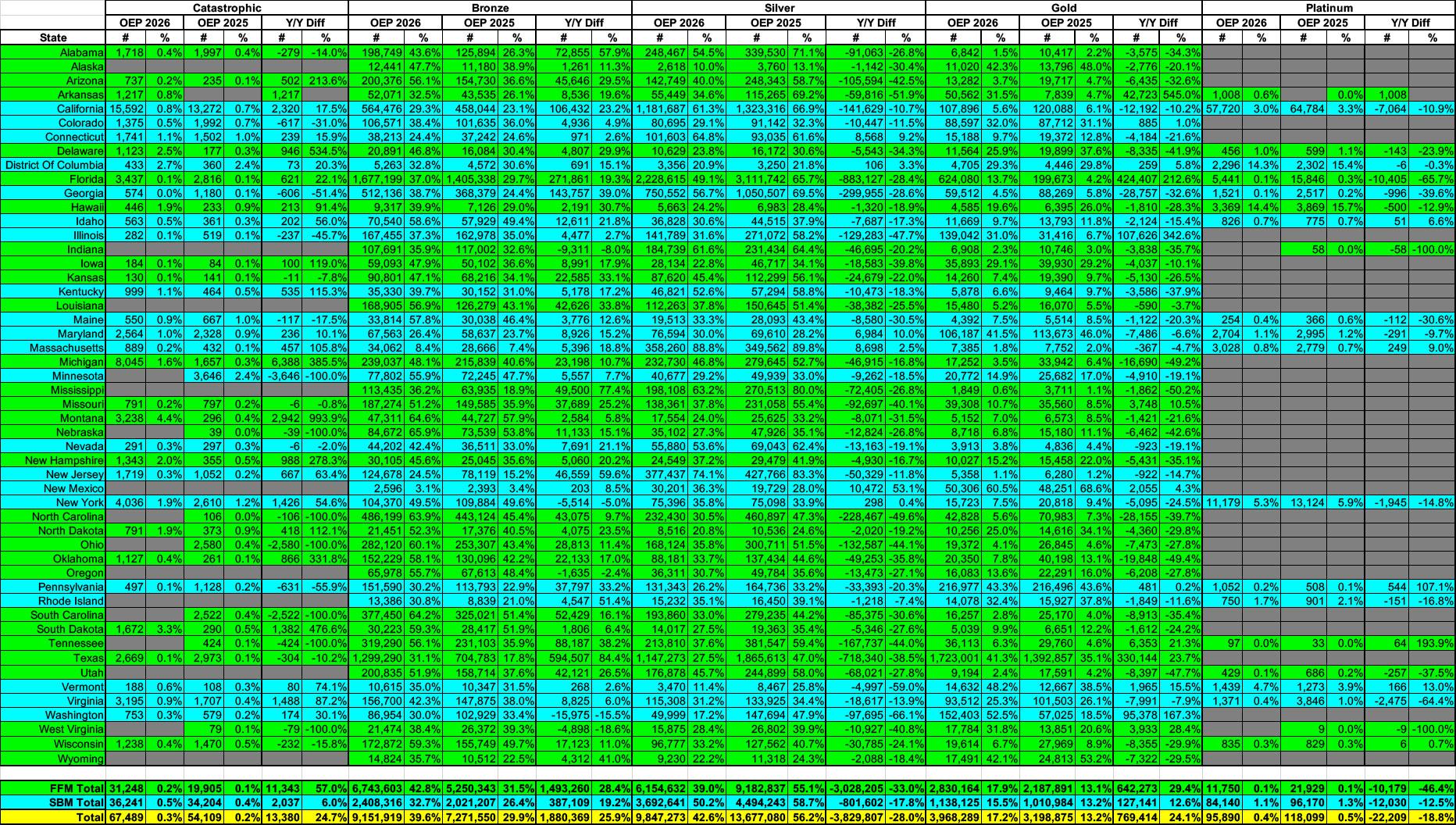 Gold Plans: This is the most interesting of the group. As I noted above, given the expiration of the enhanced federal tax credits along with new Trump Regime regulations causing several hundred thousand legally-residing immigrants to no longer be eligible for any tax credits at all, seeing several million people downgrade from higher-value plans (Platinum, Gold, Silver) to lower-value ones (Bronze/Catastrophic) is not only unsurprising but is something I was warning would likely happen months ago.