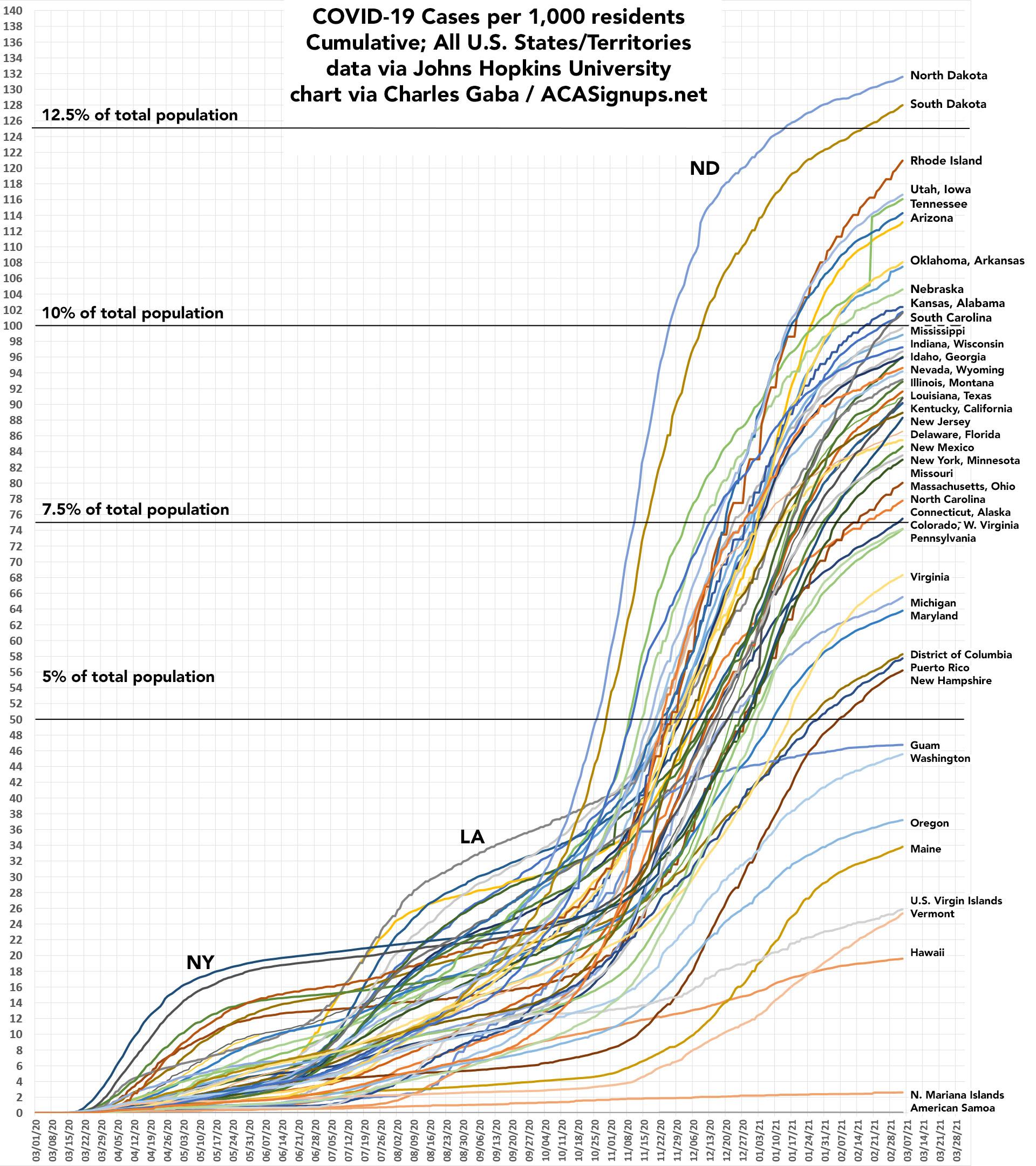 I've done my best to label every state/territory, which obviously isn't easy to do for most of them given how tangled it gets in the middle. For cases per capita, the most obvious point is that New York and New Jersey, which towered over every other state last spring, are now dwarfed by North & South Dakota, although things are pretty horrible nearly everywhere now.