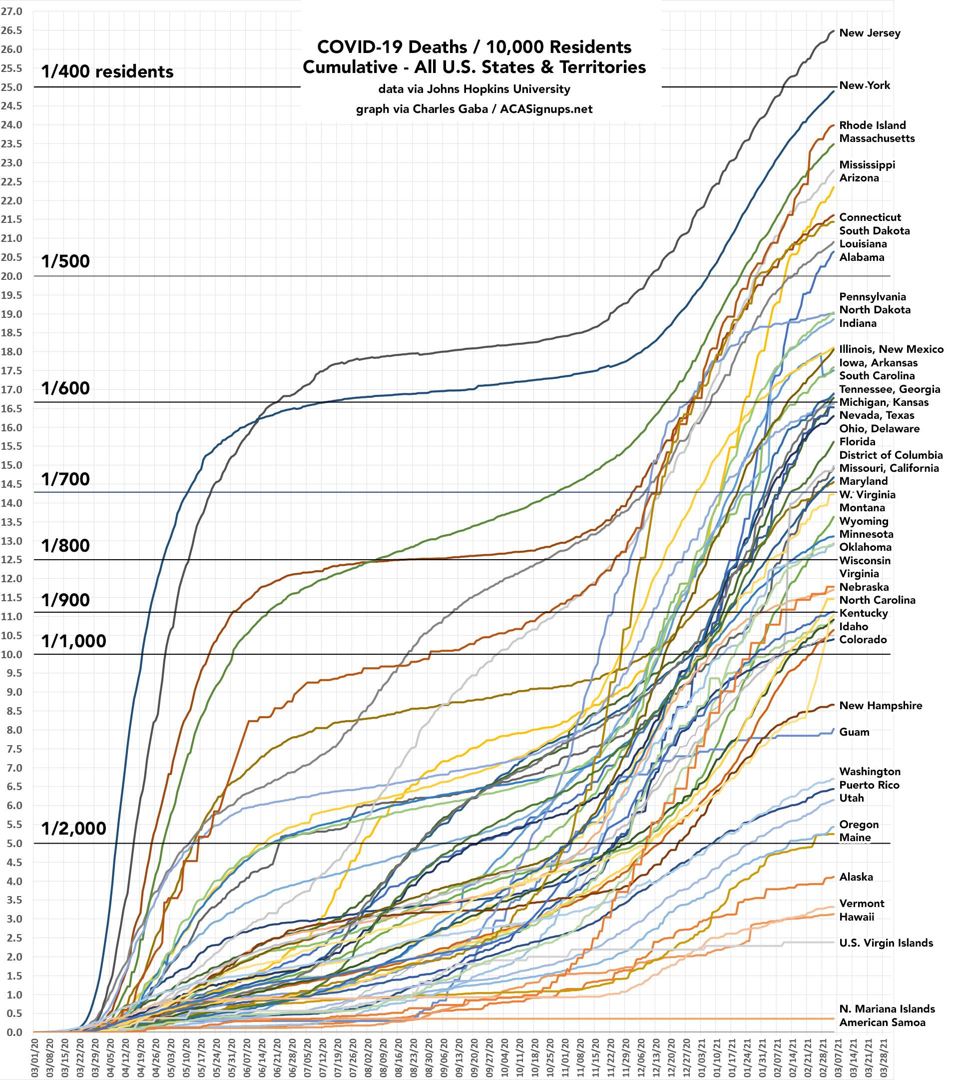 Next, let's look at the cumulative mortality rate for every U.S. state and territory. Here, New Jersey and New York are still worse than the rest of the country (primarily due to their mass deaths from March - May last spring)...but as you can see, several other states are, tragically, also catching up to them on this front as well.