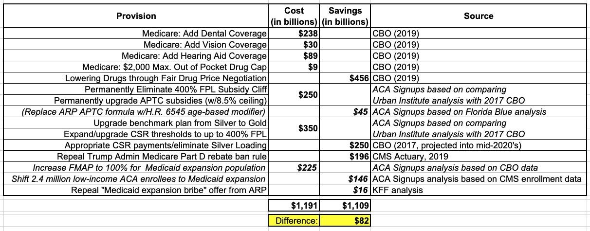 Even so, the point is that even if they do end up coming up a couple hundred billion short, there's no reason they couldn't include portions of each. For instance, they could add dental and hearing aid coverage to Medicare, but not vision and the drug spending cap. They could lock in the expanded subsidies of the American Rescue Plan and upgrade the benchmark plan from Silver to Gold, but not expand CSR assistance up to 400% FPL, and so on.