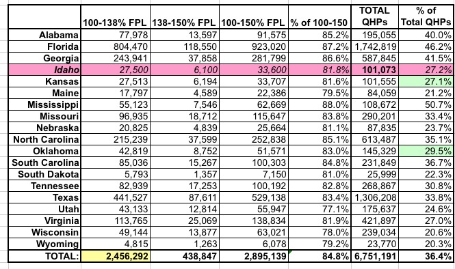 In all, 2,687,315 people within the 100-138% range selected QHPs via HC.gov this year. 18 of the 19 non-expansion states are included, because Idaho runs their own full exchange. Subtracting out the states which did expand Medicaid leaves us with the following (I'll explain my estimate for Idaho below):