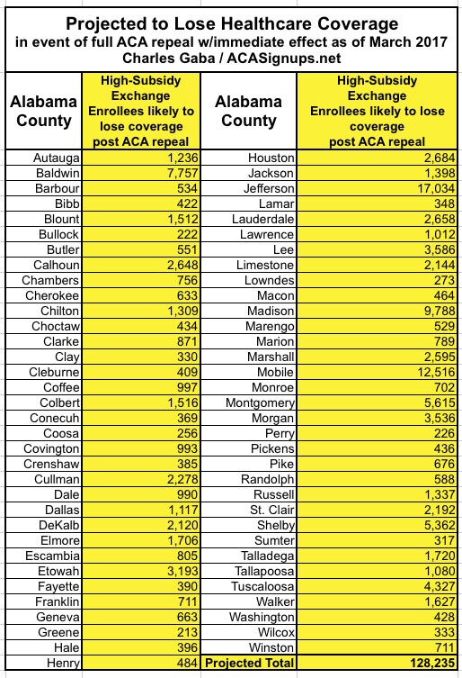 In the case of Alabama, assuming 187,000 people* enroll in exchange policies by the end of January, I estimate around 134,000 of them would be forced off of their policy upon an immediate-effect full ACA repeal.