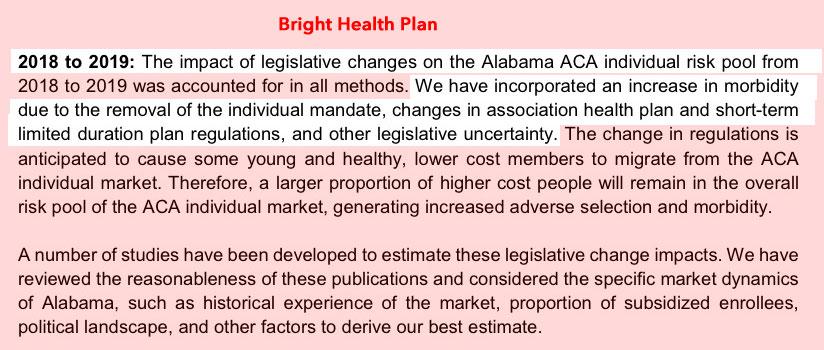 Assuming I'm close, however, unsubsidized Alabama residents should see their 2019 premiums drop by about 2% next year...except that they would be dropping substantially more if not for the mandate penalty being repealed and the expansion of #ShortAssPlans, as clearly noted in the filings for both companies. The Urban Institute assumed a whopping 21.6% sabotage tax, but I'm knocking 1/3 off that to be cautious and assuming "only" 14.4%. If so, that means unsubsidized Alabama enrollees will be paying nearly $1,200 more apiece next year than they should be: