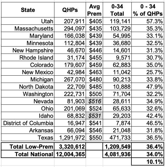 Fann and Cox noted that the second group is mostly comprised of younger enrollees due to the ACA's 3:1 age band...that is, the unsubsidized premium price for 21-year olds is 1/3 as much as for a 64-year old, which means their premiums are a lot more likely to fall beneath the maximum % of income threshold. Fann suggested looking at the states with the lowest average premiums.