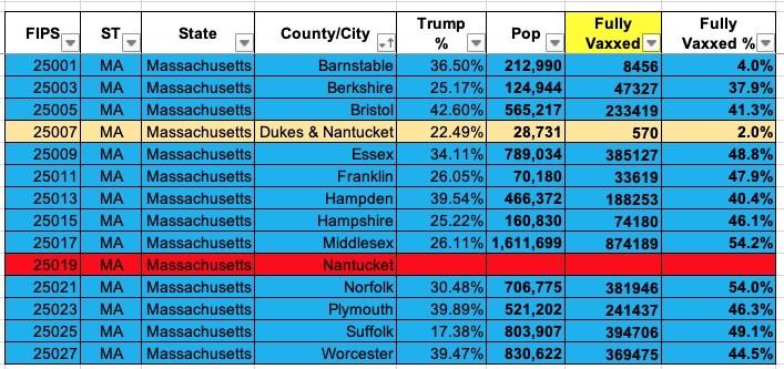 UPDATE:  There's definitely something weird going on with Dukes/Nantucket and Barnstable. Here's a map directly from the Massachusetts Health Dept. clearly showing Barnstable at 61% fully vaxxed and Dukes/Nantucket at 68/69%. Weird.
