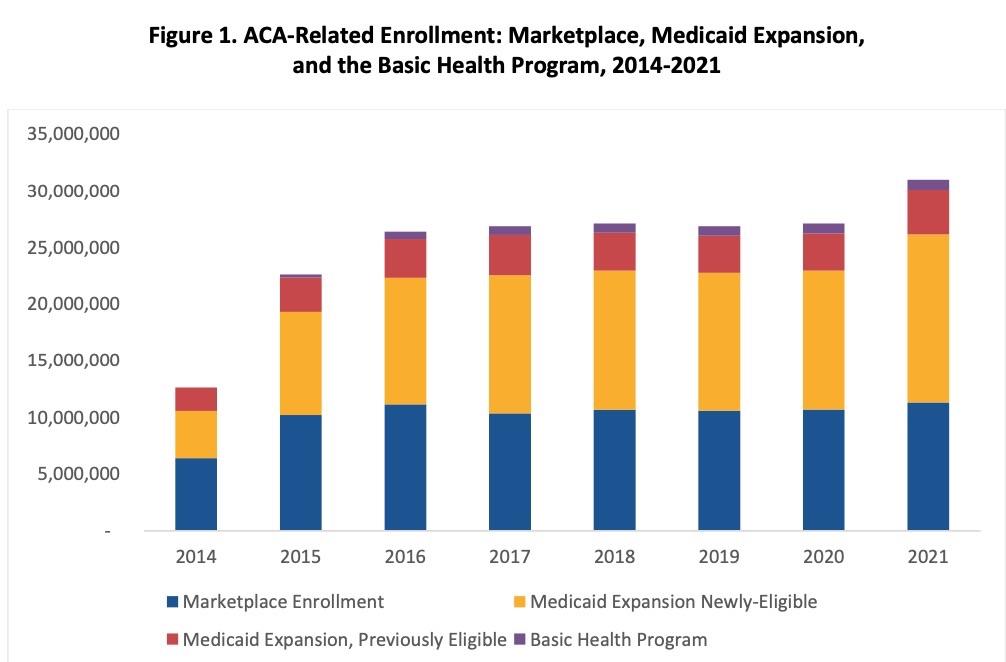 Based on enrollment data from late 2020 and early 2021, approximately 31 million people were enrolled in Marketplace or Medicaid expansion coverage related to provisions of the Affordable Care Act (ACA), the highest total on record.