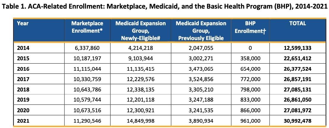 Taken together, these results indicate that overall enrollment in Marketplace coverage, Medicaid expansion, and the Basic Health Program for 2021 was approximately 31 million people, the highest enrollment total since the ACA was enacted.
