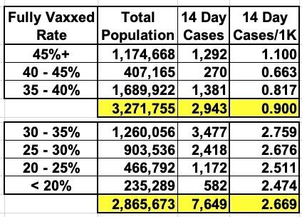 Put another way, here's every county in Missouri broken out by the percent of their total population which has been vaccinated. The counties where less than 35% of the population has been vaccinated are seeing new case rates 3x higher than those where more than 35% have been vaccinated: