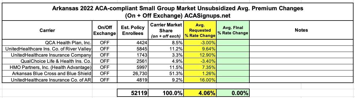 Arkansas: Preliminary avg. 2022 #ACA premium rate changes: +6.5% indy market; +4.1% sm. group