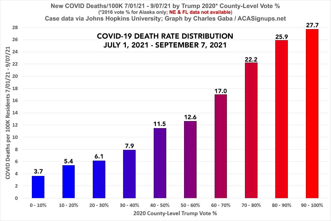 Here's the bar graph with data starting on July 1st, through yesterday (September 7th). The Y-Axis scale is obviously much smaller since the total deaths are much lower, but the trendline is far more stark: Since the beginning of July, the death rate in the reddest counties has been as much as 7.6x higher than in the bluest counties: