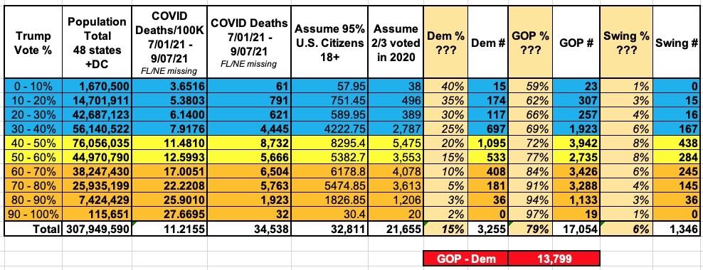 The grand total would then stand at somewhere around ~105,000 Democratic voters, ~220,000 Republican voters and ~26,000 swing voters having died nationally between 11/04/20 - 11/08/22...or a net loss of perhaps 115,000 more Republicans than Democrats overall.