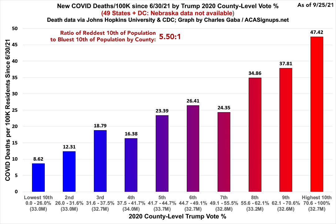 The case rate since 6/30/21 is 3.1x higher in the reddest counties (Trump >70%) than in the bluest counties (Trump < 26%).