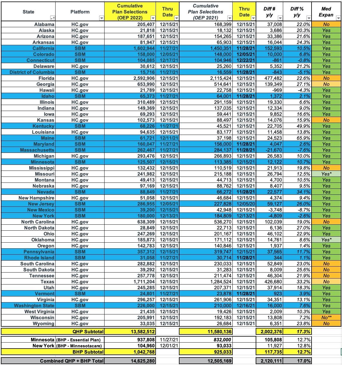 As far as I can figure, nationally, when you include both QHPs & BHPs, overall enrollment as of mid-December has already broken 14.6 million nationally. That's over 2.1 million people higher than last year as of the same point in time, or up around 17.0% year over year.