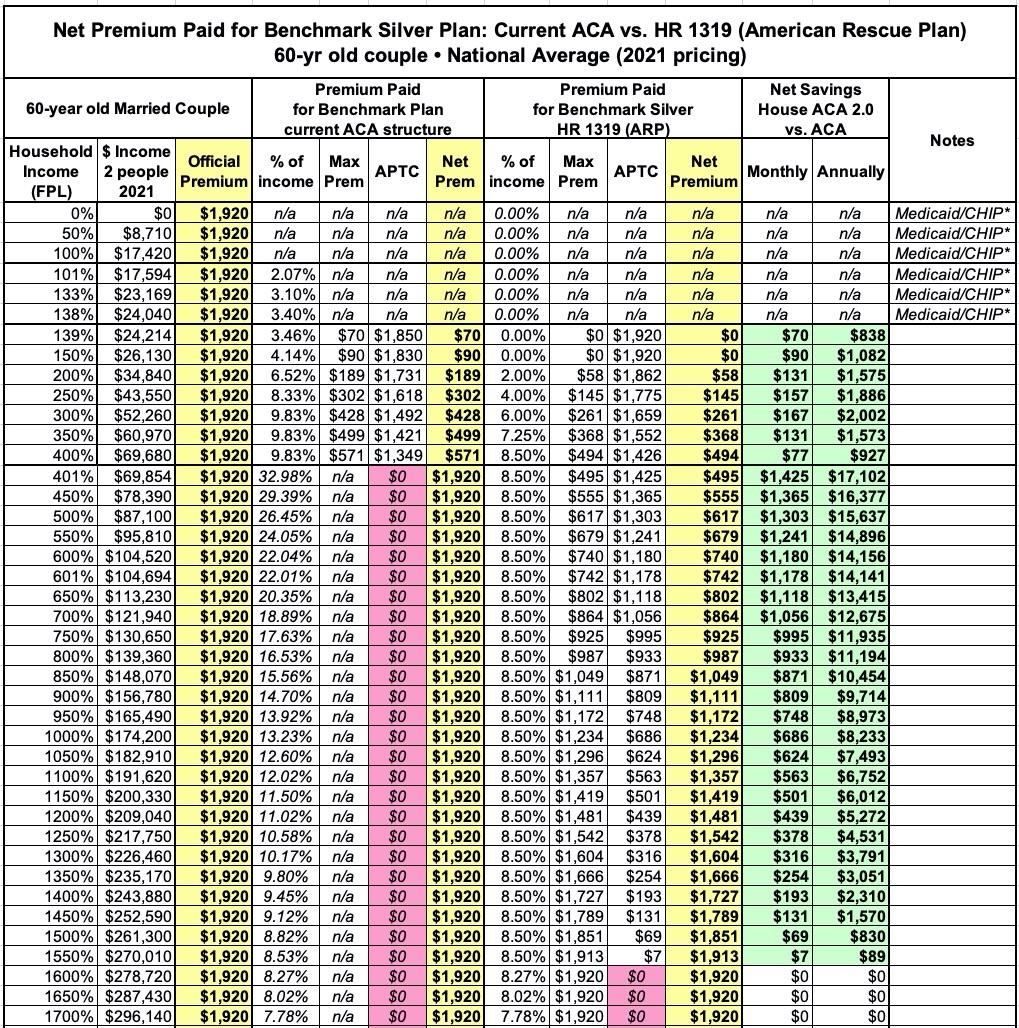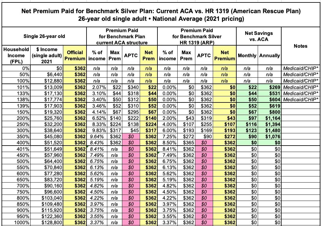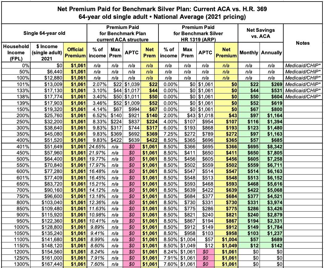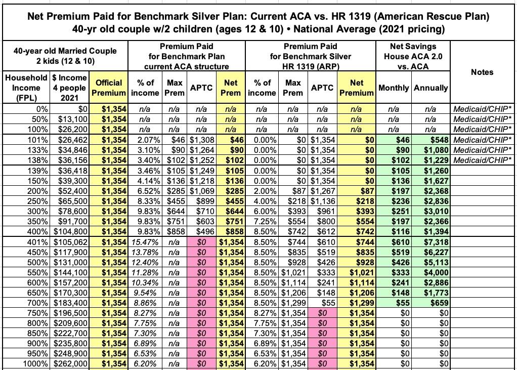 In this version I'm using the actual Advanced Premium Tax Credit (APTC) table under the American Rescue Plan, and I'm cutting out all references to the other two tables to avoid confusion.