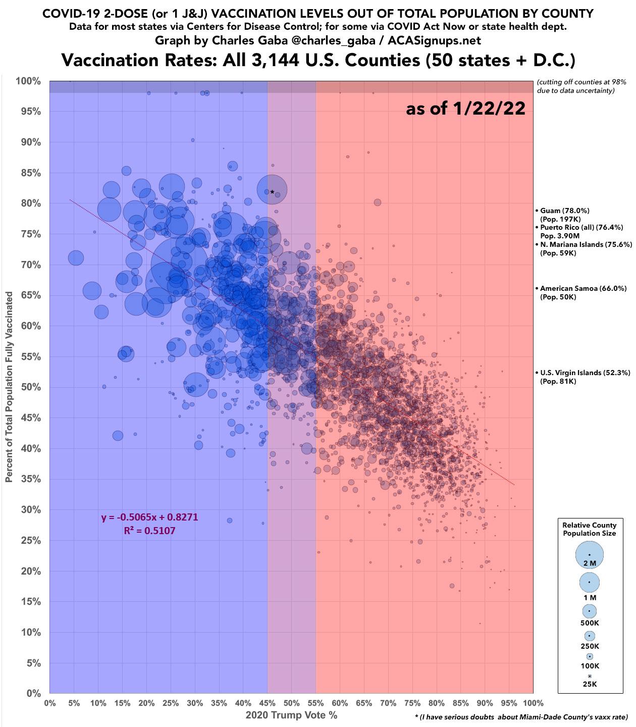 - IMPORTANT: There are several counties which have supposedly surpassed 100% vaccination rates; obviously that's impossible, and is due to discrepancies in either the vaccination data or actual population counts. In addition, people have moved, died, etc. since the 2020 Census was locked in as of April 2020. With that in mind, I've started setting the maximum vaccination rate for any county at 98% with one exception: Kalawao County, Hawaii, which only has 82 residents & is a special case.