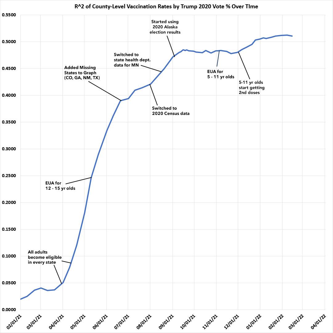As I predicted back in mid-November, the most obvious reason for both the R-squared and slope increasing again recently is that 5 - 11 year-olds started receiving their 2nd Pfizer shot around Thanksgiving. The parents who were most likely to have gotten vaccinated themselves earlier this year are pretty clearly the ones most likely to get their children vaccinated, and the parents least likely to get vaccinated are, sadly, also those least likely to vaccinate their children either: