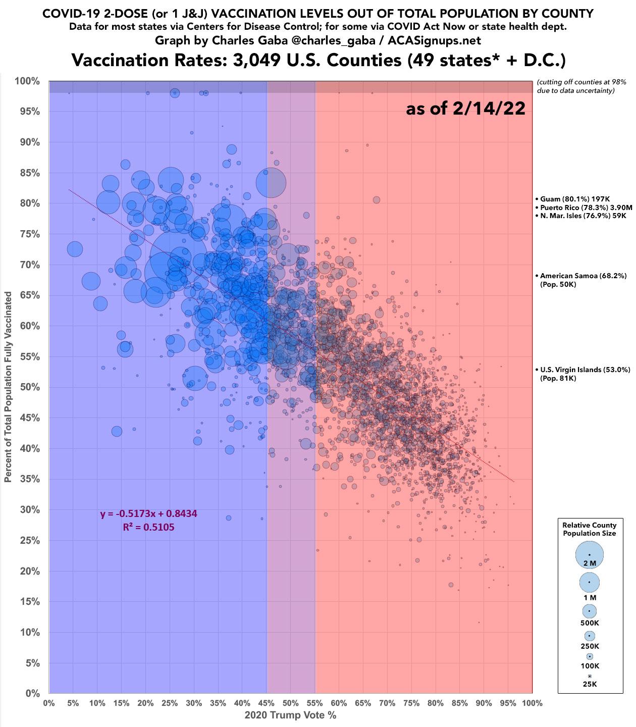 • There are several counties which have supposedly surpassed 100% vaccination rates; obviously that's impossible, and is due to discrepancies in either the vaccination data or actual population counts. In addition, people have moved, died, etc. since the 2020 Census was locked in as of April 2020. With that in mind, I've started setting the maximum vaccination rate for any county at 98%.