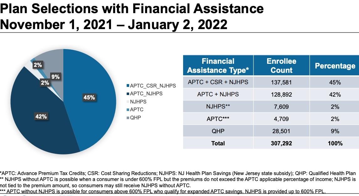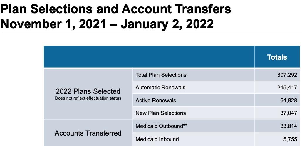 As of January 2nd, a total of 307,292 residents are signed up for 2022 health coverage through Get Covered New Jersey, including more than 90,000 new or existing consumers who actively selected a plan and 215,000 who were automatically renewed during the Open Enrollment Period that began November 1st. The total number is the highest ever signed up for marketplace plans during an Open Enrollment Period since enactment of the Affordable Care Act and the start of health care marketplaces in 2014. Total signups are up 21 percent compared to this time last year, with an additional 53,000 health plan selections.