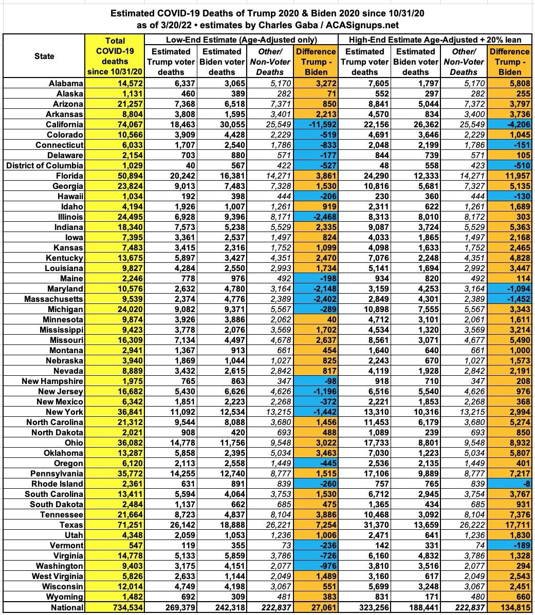 If accurate, the high-end estimate would mean roughly 71% more Trump voters than Biden voters have died of COVID since the 2020 election: