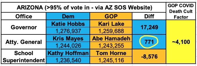 That leaves just Arizona Governor and Arizona Attorney General, where Democrats are down to a 26,000 and 11,300 vote winning margin respectively. Again, if either of these end up with the Democrats winning by less than around ~4,100 votes, there you go:
