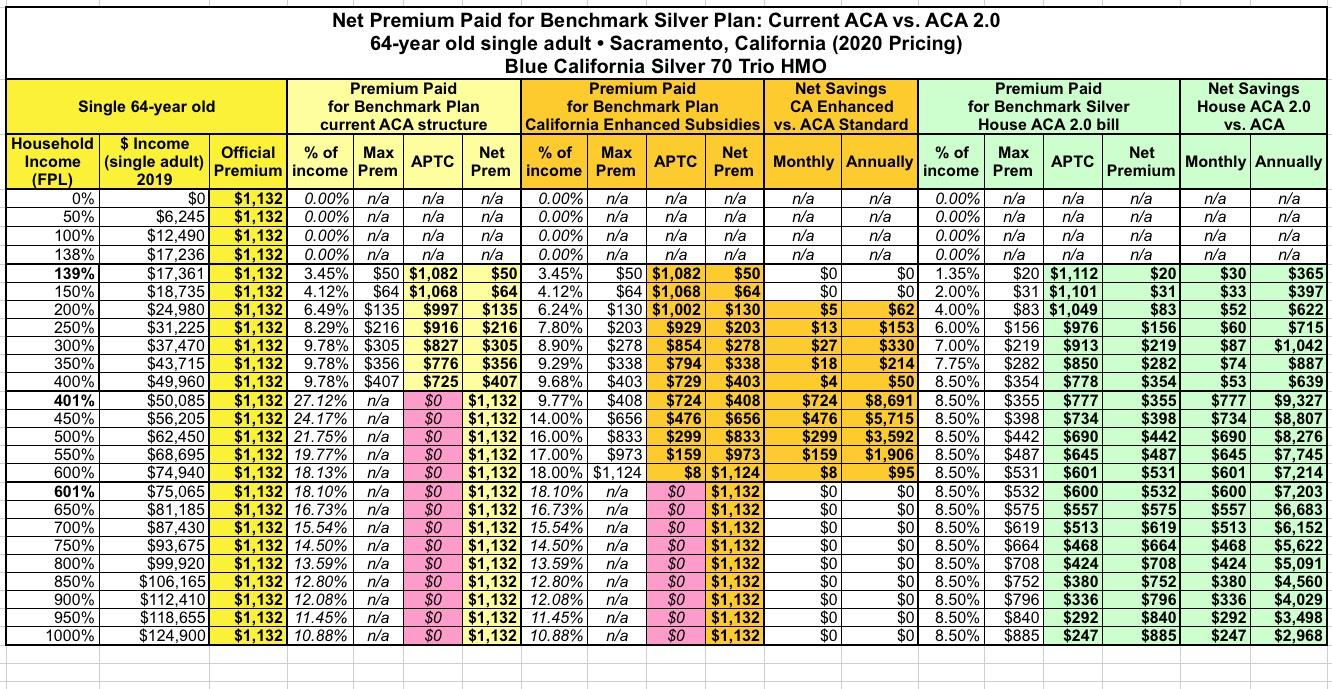 At 64 years old, California's expanded subsidies will save them up to $8,700 if they earn between 400-600% FPL...and from 250 - 400%, they'd save as much as an additional $330.